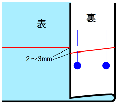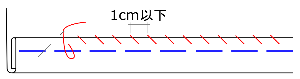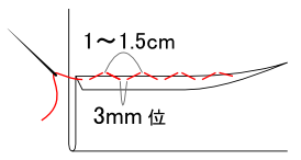 縫い代側は普通に針を通して構いませんが、表になる側は表に糸が見えないように生地を数目拾います。