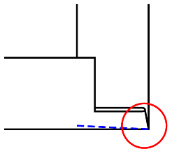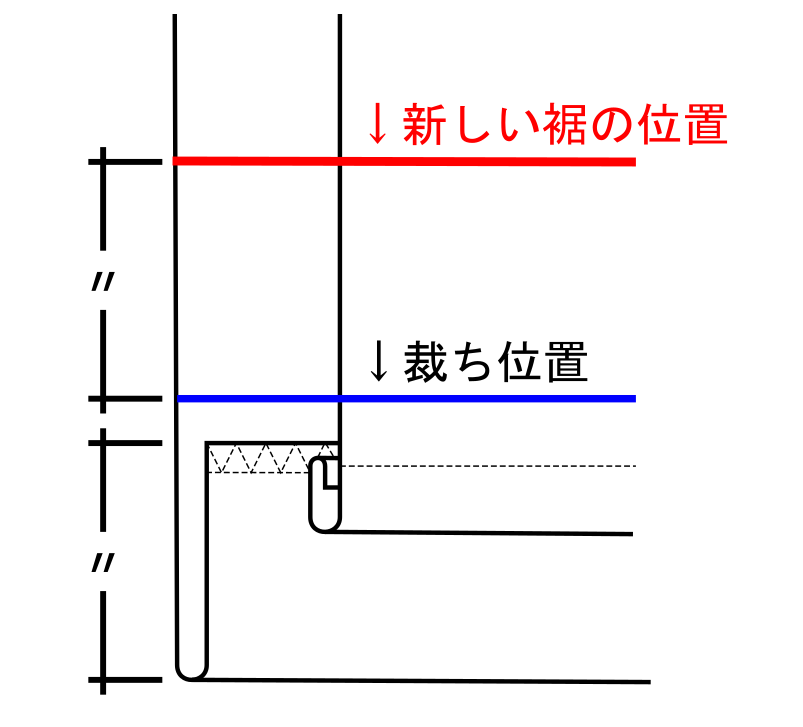 少しくらいならそのままでも大丈夫ですが、気になる場合は、図の赤線ように裾の脇を縫い直します。(青線が出来上がりの位置です)