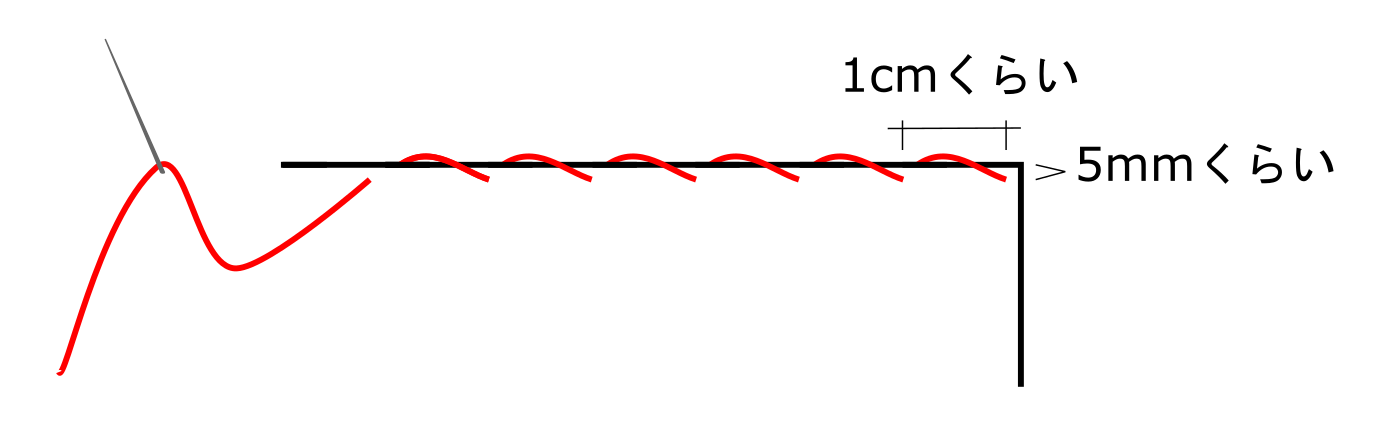 縫い始めは出来上がりより上の縫い目に2cmほど重ねて縫います。