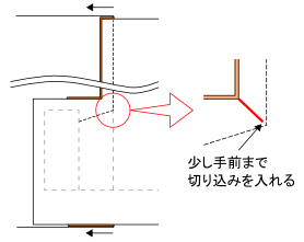 ベンツ部分の角の、上側の縫い代一枚だけに切り込みを入れます。縫い目を切らないよう少し手前で止めます。