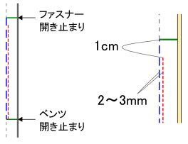ミシンの針目を一番大きく(粗く)します。針を印のウエスト側に下ろします。ファスナー部分の開き止まりの1cmほど下まで縫い、いったん止めます。ミシンの針は生地に刺した状態にします。(赤点線)